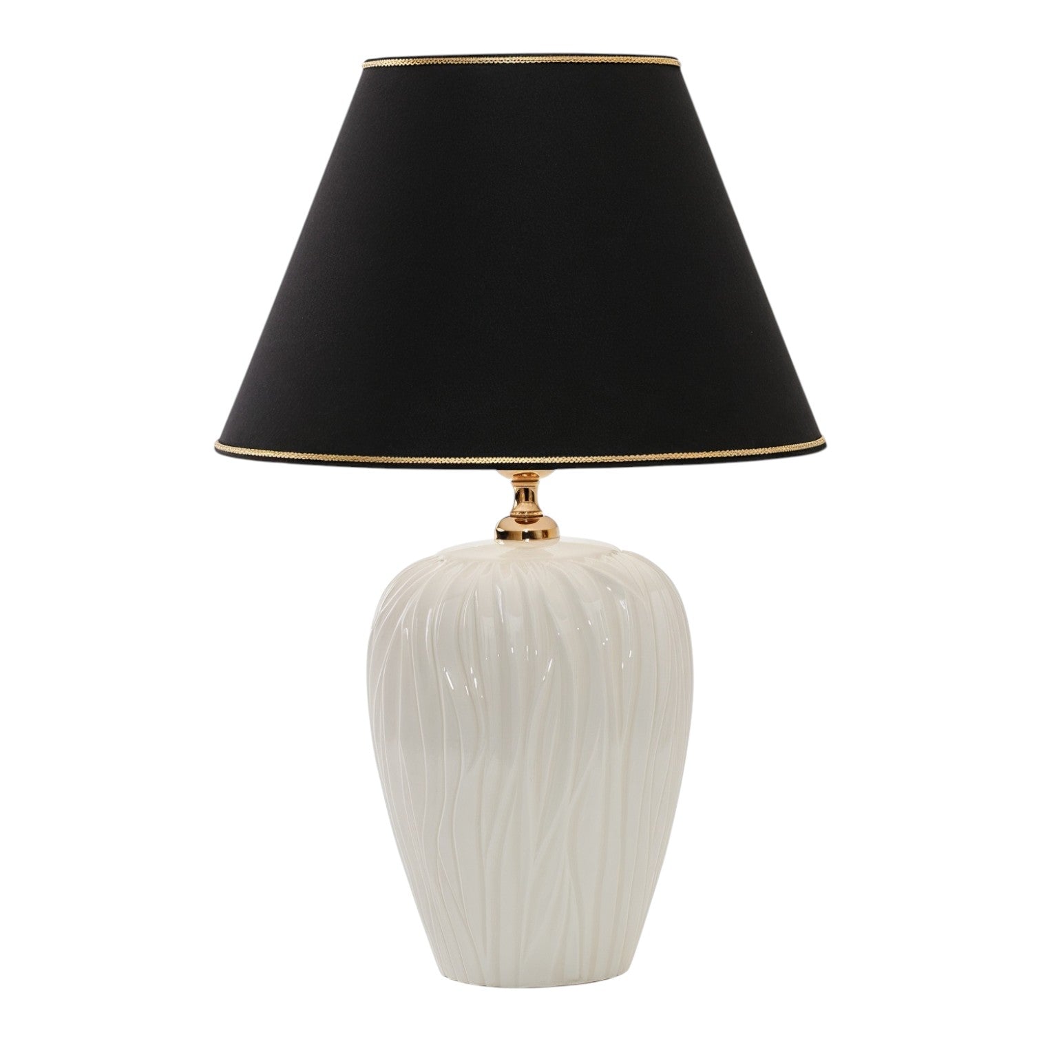 Diese elegante Tischleuchte besticht durch ihr strukturiertes Design und luxuriöse goldene Akzente. Ideal für ein stilvolles, modernes Ambiente.
